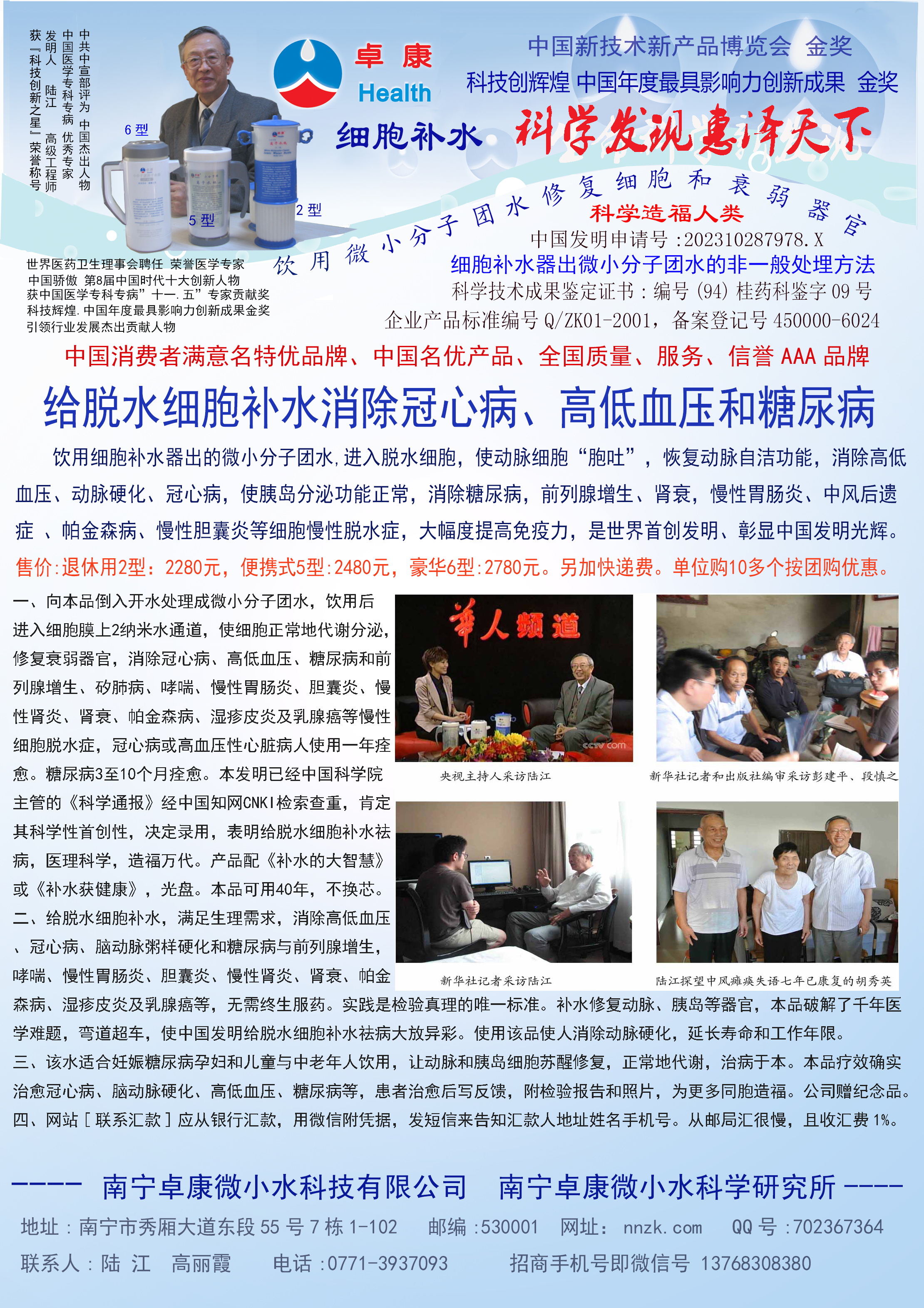 人類幾千年來患以上病癥需終生服藥,幾十年也不能治愈??墒俏覈蠈幍母呒壒こ處熽?nbsp;江,于1990年想根治高血壓,研究發明了離子水瓶,處理出微小分子團水供飲用,經過醫院臨床試用和專家鑒定,1999年獲中國發明專利權,產品于2000年投放市場后一直跟蹤調查,據全國各地用戶反饋:祛除了高低血壓、糖尿病和冠心病,并使前列腺增生、咽喉炎、鼻竇炎、慢性氣管炎、支氣管炎、矽肺病、哮喘、慢性胃炎、腸炎、慢性膽囊炎、慢性腎炎、腎衰、膀胱炎、便秘、痔瘡、風濕性關節炎和濕疹皮炎及中風后遺癥等病癥不藥而愈。為什么喝微小水能治20多種???陸 江從1991年德國科學家發現細胞膜水通道僅為2納米獲得啟發,認為多種器官患病是因細胞脫水,不能正常代謝和分裂增殖,才使器官細胞減少致衰弱萎縮而形成細胞缺水性病癥。22年來的實踐有力地支持了“細胞脫水致病”這一重要論點,表明喝微小水可滿足細胞的生理需求,補水就能祛病,是生命科學新亮點。